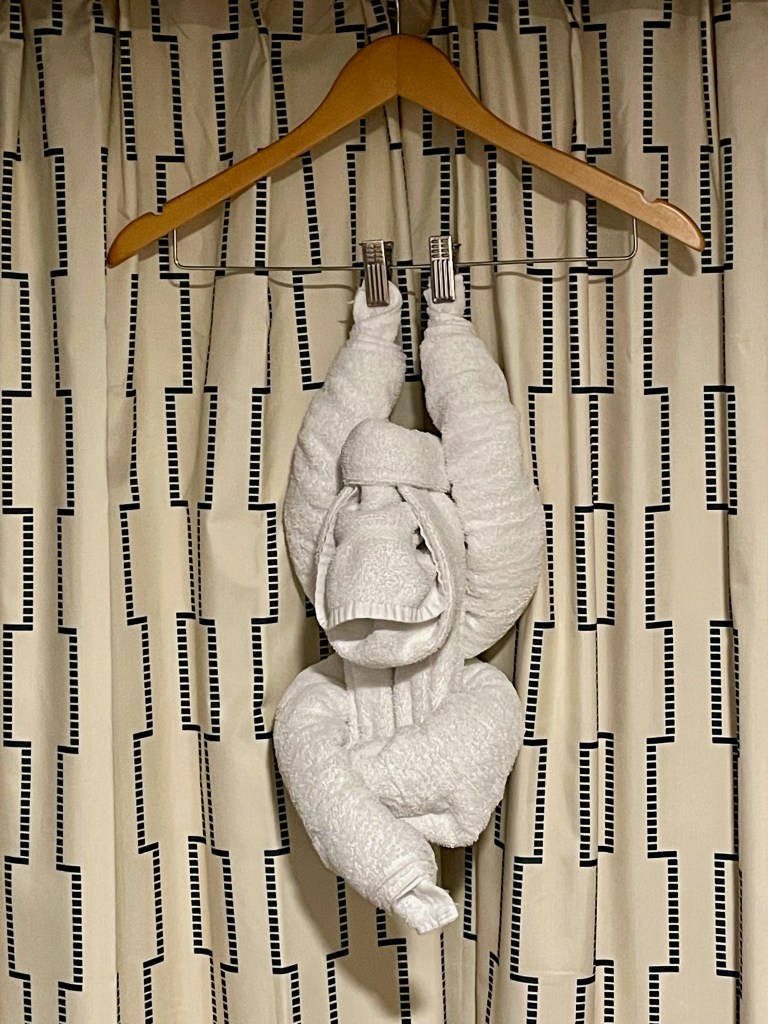 Have any of you been on a cruise? If you like ginormous high-end luxury hotels floating on the sea with as many night clubs, broadway caliber entertainment, restaurants, spas, trivia contests, game shows, rollerskating, bumper cars, fitness rooms, waterslides, pools and oh yeah, those just sit in there while the bubbles envelop you hot tubs! Those are just some things to mention. In other words– tons of things to do! And all right at your finger tips day and night. You should definitely book one pronto. One of the coolest things is the surprise monkey towel animal hanging from your sliding glass door that looks out onto the ocean. If you’re a cruiser and this is now my 4th! You will adore the towel animals that greet you in your state room. They’re so darn cute!